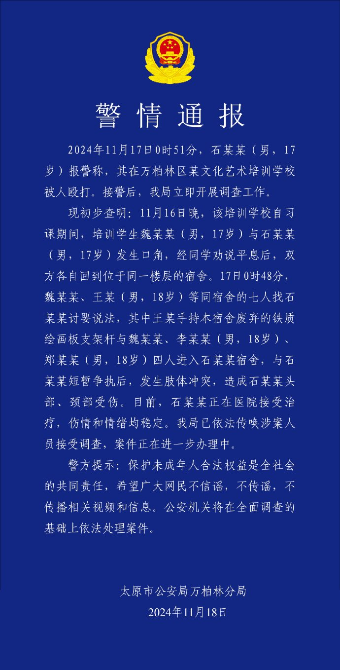 太原市公安局万柏林区分局11月18日通报,目前,石某某正在医院接受治疗,伤情和情绪均稳定。警方已依法传唤涉案人员接受调查,案件正在进一步办理中。相关新闻一家长曝儿子被8名学生持钉棍殴打!山西警方已介入 ......
